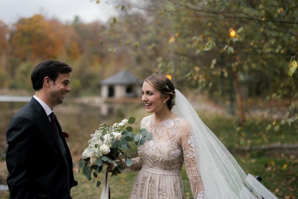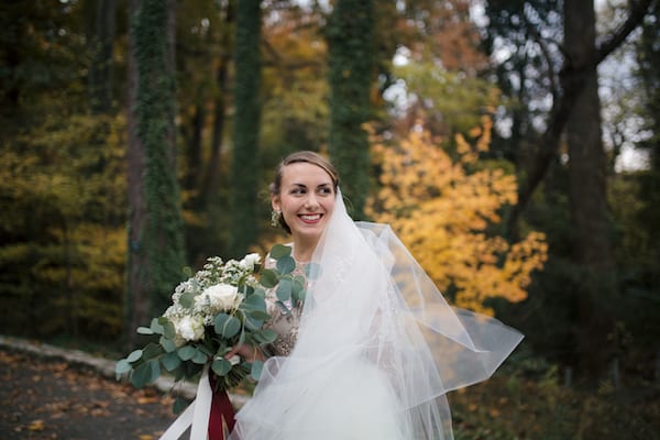 In gorgeous shades of deep burgundy, Sarah and Ross art deco wedding was elegant and romantic in every way. The day started with their first look at a nearby park close to The Church of the Good Shepherd. Our bride in BHLDN walked down a long path to meet her husband who was waiting for her by a lake. On the way, there were two deer that walked out on the path past her she shares as her more memorable part of the day. “Just getting to see my husband before the wedding was my favorite because we could really pause and take in the day with each other before the craziness started.”