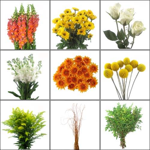 This bright yellow, orange, and white wildflower packs is perfect for an outdoor fall wedding ceremony and indoor reception! It is extremely rustic because of the natural elements such as billy balls, curly willow tips, and solidago. Use the pompon Vykings (mini sunflower look-alikes) and billy balls (Crespedia) to make boutonnieres! The Roses, snapdragons, pompon cushions and stock make for solid flowers to mix in a bouquet! No matter how you do it, this pack would look beautiful in a fall wedding.